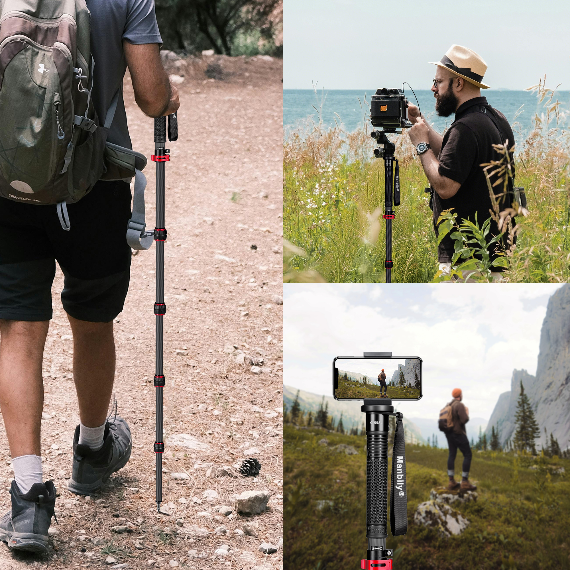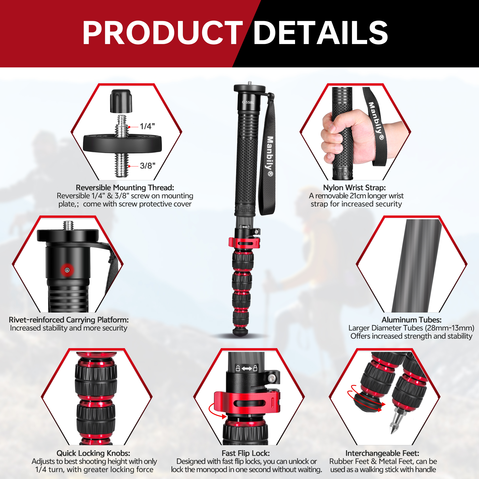 Manbily C-558L Carbon Fiber Lever Lock Monopod, Quick Height Adjustment,16 inch, 28mm Tube, Suitable for use as a hiking pole