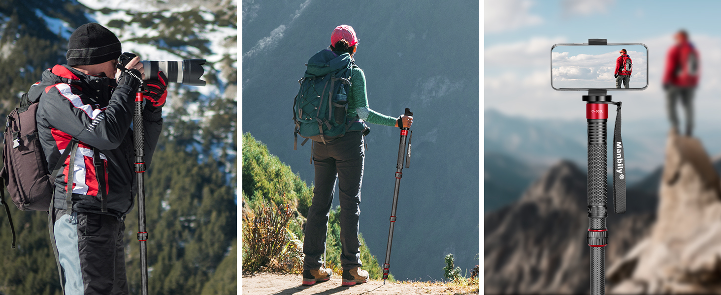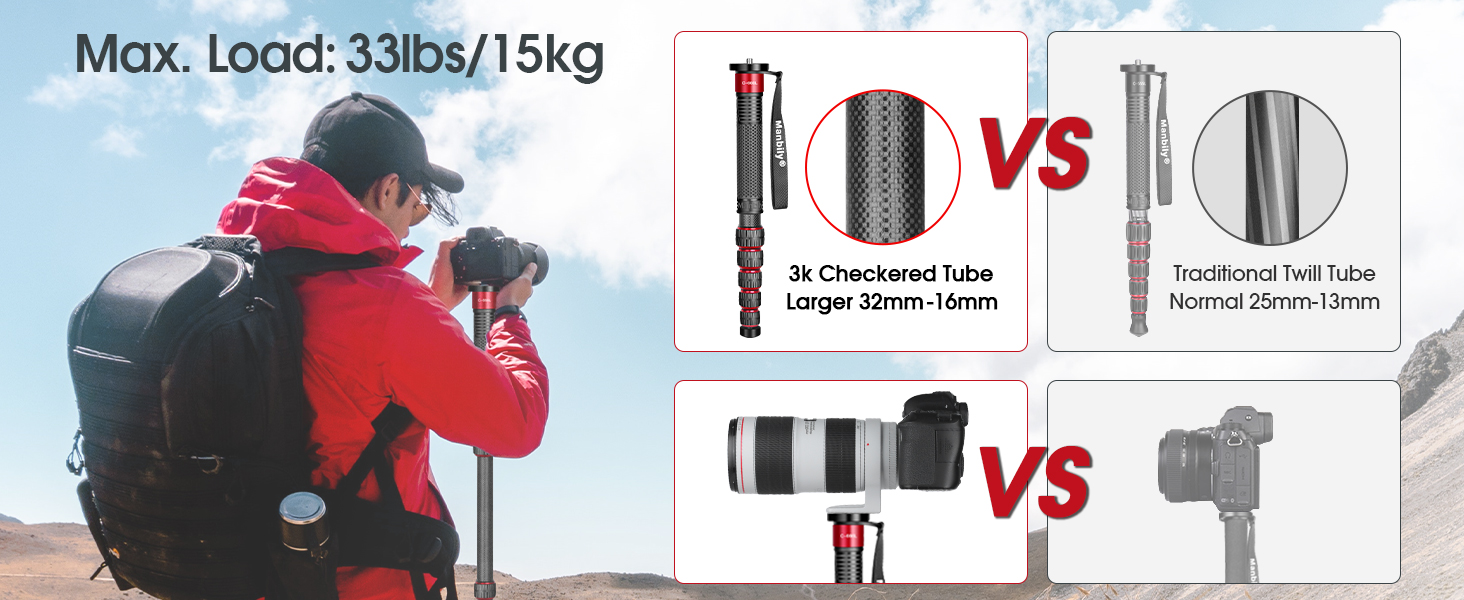 Manbily Camera Monopod Carbon Fiber 32mm Tube, Max. 33lbs (RED) C-666L