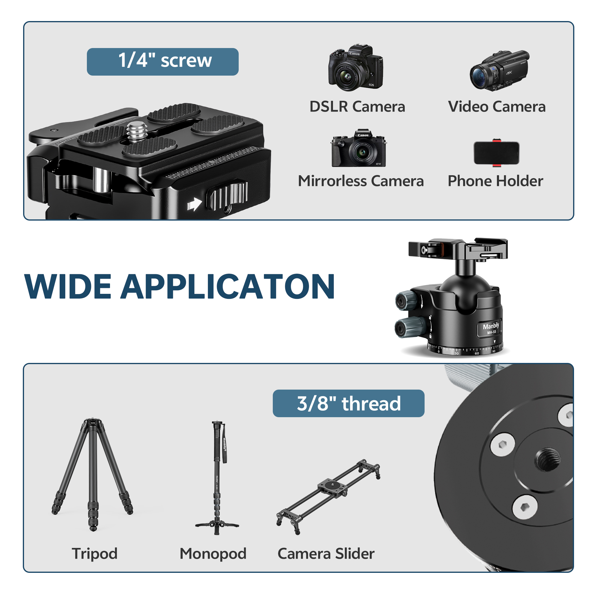 Manbily MH-55 55mm Low Profile Ball Head with Picatinny & Arca Swiss Dual Mount, 25kg Max Load Capacity
