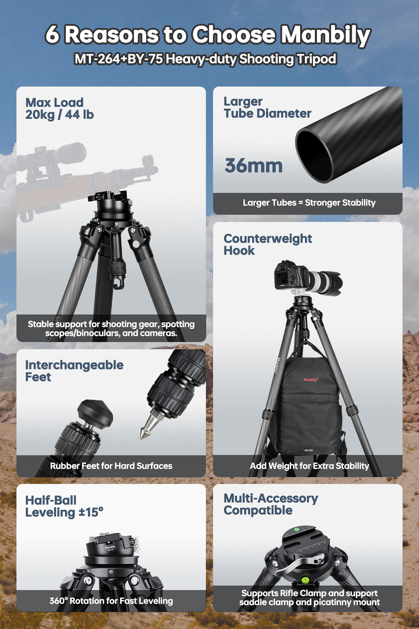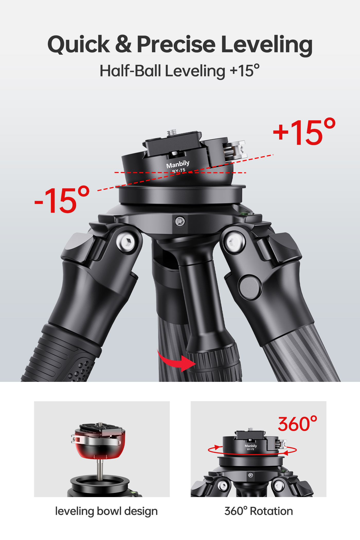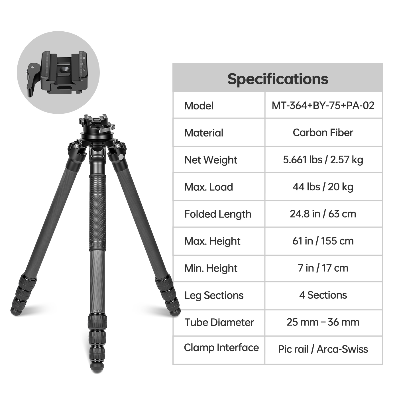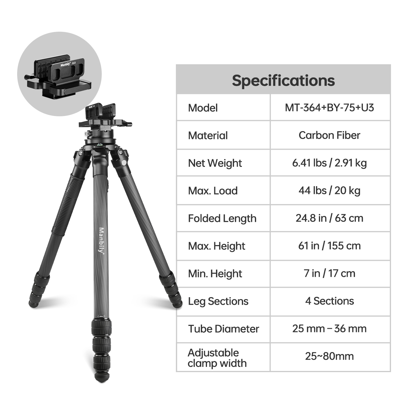 Manbily MT-364+BY-75 Carbon Fiber Heavy Duty Tripod, 36mm Max Tube Diameter with 75mm Platform Bowl Leveling Head